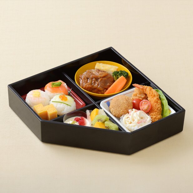 - ハンバーグ、スペイン風オムレツ、ブロッコリー、人参、唐揚げ、海老フライ、ライスコロッケ、ミニトマト、スパゲッティサラダ、玉子焼き、サーモン手毬寿司、海老手毬寿司、イクラと胡瓜の手毬寿司、パパイヤ、グレープフルーツ、キウイ、カップケーキ