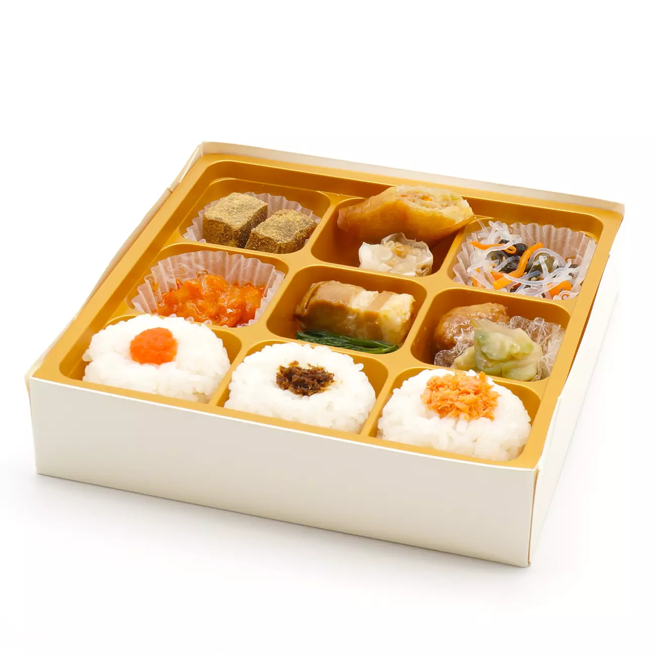 海老チリ、豚角煮、青菜、肉団子、ザーサイ、春巻き、焼売、中華春雨、おにぎり(明太子、おかか、鮭)、黒糖わらび餅