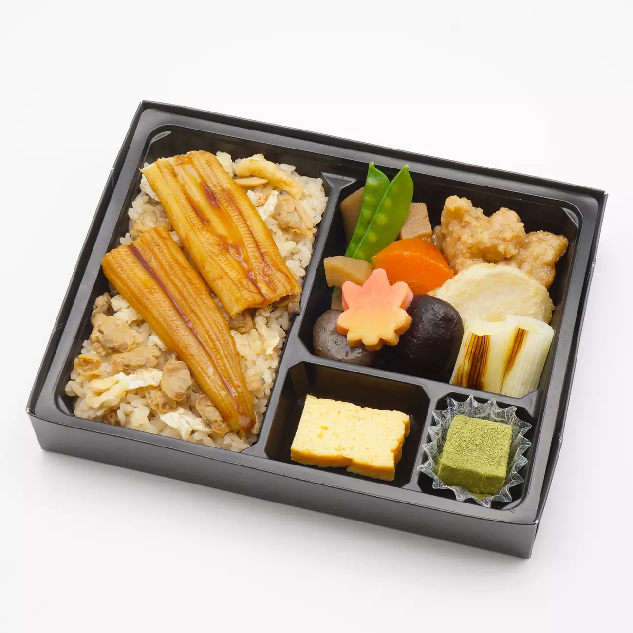 - 鶏治部煮(鶏肉、里芋白扇揚げ、焼きネギ)、筑前煮(人参、蓮根、蒟蒻、筍、牛蒡、絹さや、椎茸、花麩)、玉子焼き、深川めし(浅蜊御飯、浅蜊味噌煮、煮穴子、油揚げ)、抹茶わらび餅
