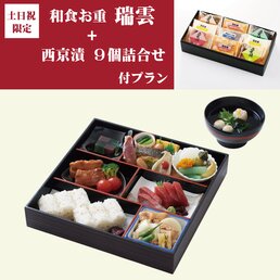 容器回収商品【和食お重】瑞雲+西京漬ギフト付プラン(ずいうんさいきょうづけぎふとつきぷらん)6,156円(税込)【土日祝お届け限定】人気の会席お重に明治座定番土産「西京漬9個詰合せ」付きのお得なプランです。