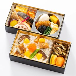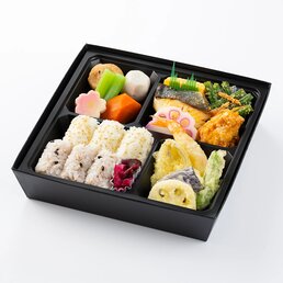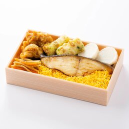 容器回収商品【幕の内お重】平安(へいあん)2,376円(税込)劇場でも人気のお土産の西京漬けを焼き上げた「銀鱈の西京焼き」に加えて天ぷらやローストポークが入った満足感の高い幕の内お重です。